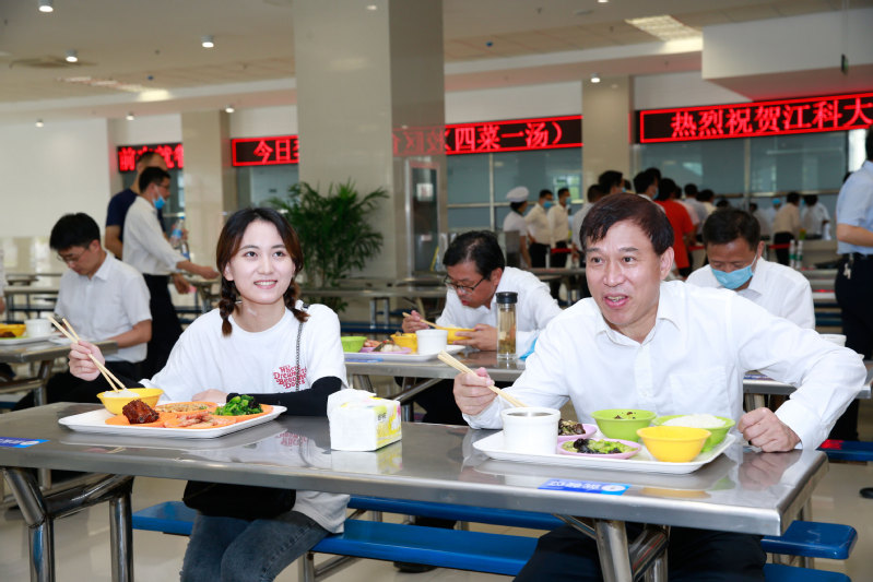 十里長山秀,百畝碧波柔。6月26日,江蘇科技大學新校區西苑食堂揭牌開業,校黨委書記葛世倫、黨委副書記許俊華、副校長姜朋明,鎮江市高校園區建設指揮部副總指揮馬士良,中船第九設計院副院長魯峰,中江國際江科大項目部經理朱偉平,校黨委常委周春燕、劉新波等共同見證揭牌開餐,校黨委副書記許俊華致辭,鎮江市高校園區建設指揮部副總指揮馬士良、中船第九設計研究院副院長魯峰分別講話,副校長姜朋明、中江國際江科大項目部經理朱偉平為西苑食堂揭牌。