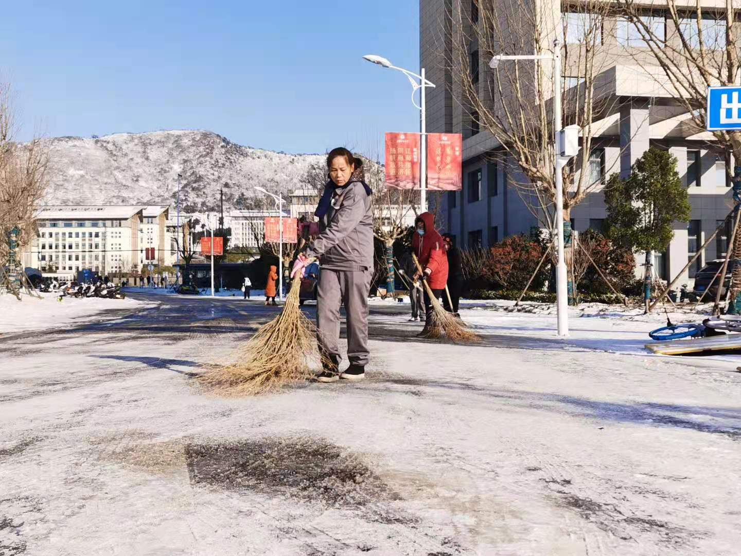 按照工作預案,30日凌晨,一組人員集中清理北大門周邊道路,另一組重點清理圖書館南面的浦江路,其他人各自為戰,負責打通教學樓宇、學生公寓和學生食堂門口的道路。由于天氣寒冷,積雪都已結冰,增加了清理的難度。大家不畏嚴寒、分工協作、相互配合,有的用鐵鍬鏟,有的用掃帚掃,有的撒融雪鹽,有的鋪防滑草墊,經過三個多小時奮戰,幾條主干道和樓宇前的通道全部打通,保證了師生出行安全。華舟物業的朱麗萍一邊賣力地鏟除船舶土建樓地下停車場入口處的積雪一邊說:“停車場入口朝北,路面上凍后異常堅硬,撒上工業鹽過了些時間,冰面在能夠逐漸被鏟除,但依然十分困難”。物業中心的徐才生介紹,長時間在零下的低溫環境工作,“剛開始冷得直發抖,但是大家都很投入地干活,越干越熱,現在身上都在冒汗,已經感覺不到寒冷。”