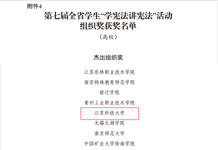 近日,省教育廳公布了第七屆全省學生“學憲法講憲法”活動評選結果(蘇教法函〔2022〕11號),我校榮獲高校組“杰出組織獎”。全省共35個單位(7個教育局、14所本科、14所高職高專院校)獲“杰出組織獎”。