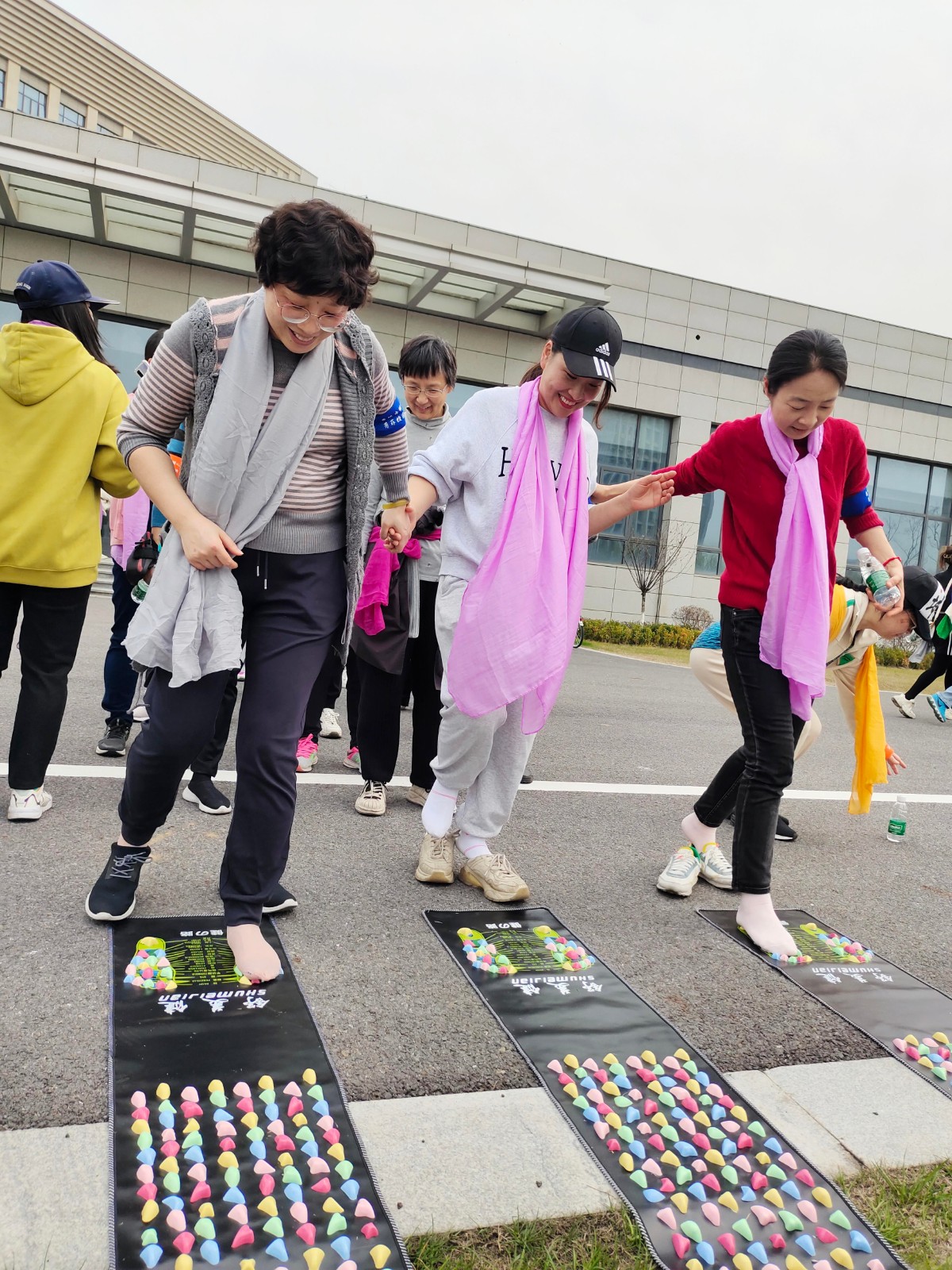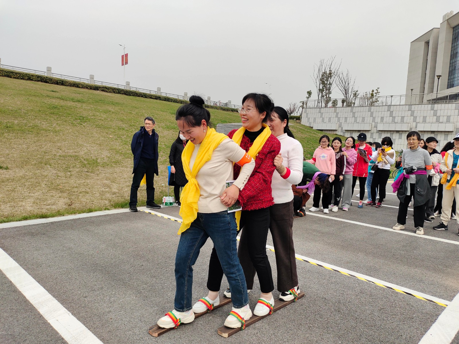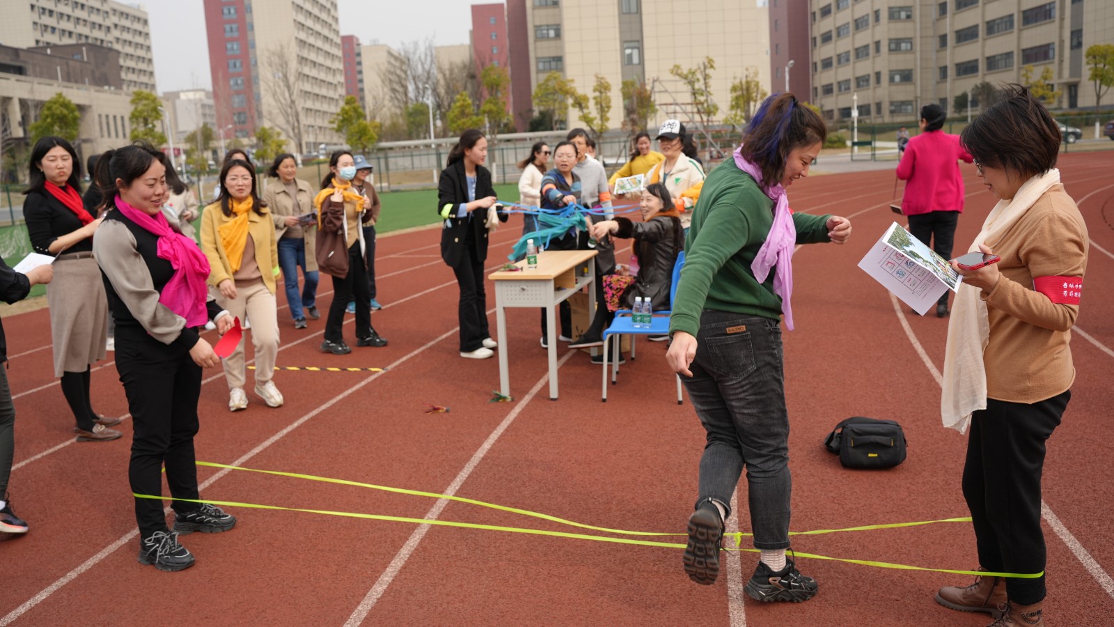 “絲韻流芳”要求3名隊員各選一條絲巾,完成不同的系法并合影;“同舟共濟”需要隊員穿同舟共濟木板鞋,走完規定路線;“砥礪前行”環節隊員手牽手,不穿鞋從趾壓板上共同走過,手均觸到校標;“巾幗射手”“飛盤麗影”“重回童夢”……九個關卡九重考驗,比的是智慧,賽的是體能,競的是合作?;顒蝇F場高潮迭起,氣氛熱烈而緊張,場內的歡呼聲、歡笑聲、鼓掌聲、喝彩聲不斷,大家沉浸在節日的快樂氛圍中,收獲滿滿,幸福滿滿。