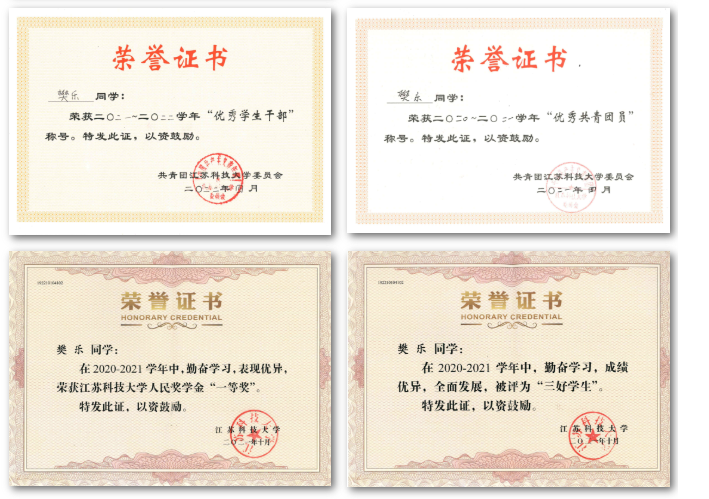 樊樂,2019級船舶與海洋工程學院工程力學專業,保研至大連理工大學。在校期間榮獲第十屆全國海洋航行器設計與制作大賽特等獎、一等獎,第十一屆全國海洋航行器設計與制作大賽二等獎,江蘇省力學創新創意競賽一等獎,鎮江市社會實踐先進個人,江蘇科技大學優秀學生干部、優秀共青團員,江蘇科技大學一等人民獎學金。