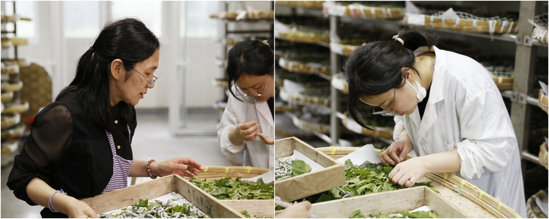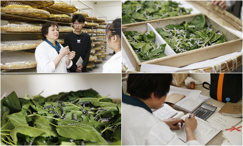 早上七點,養蠶育種室高級農藝師劉明珠老師已經到達蠶室。她每年的工作基本以50天為一個區間,周而復始循環往復,摘喂桑葉、清理蠶糞、將繭剖開稱重、分辨雌雄進行制種、給蠶室消毒......在蠶的生長旺盛期要忙到很晚才能下班。家蠶的孵化生長期從3月持續至12月,這意味著一年當中有整整10個月時間,劉老師要持續工作,一天都不能夠休息,“沒人非要你這樣做,一切都是源于內心的熱愛,全憑自愿。”