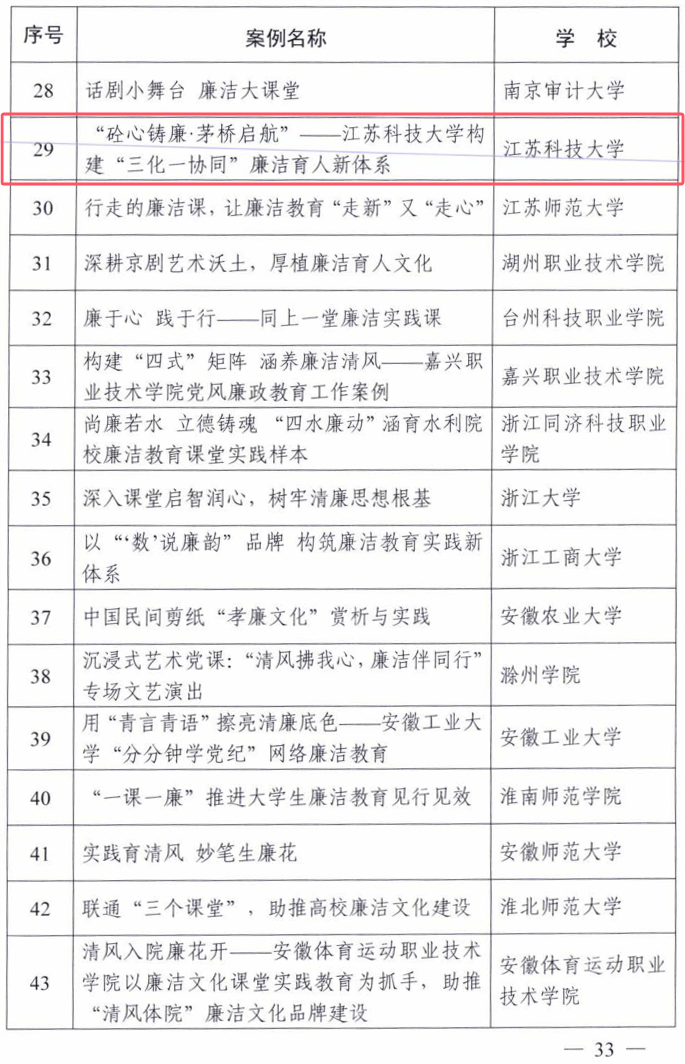 近日,教育部辦公廳公布了第九屆高校廉潔教育系列活動評審結果,由我校推薦、土木工程與建筑學院完成的《“砼心鑄廉·茅橋啟航”——江蘇科技大學構建“三化一協同”廉潔育人新體系》成功入選課堂實踐案例遴選名單。