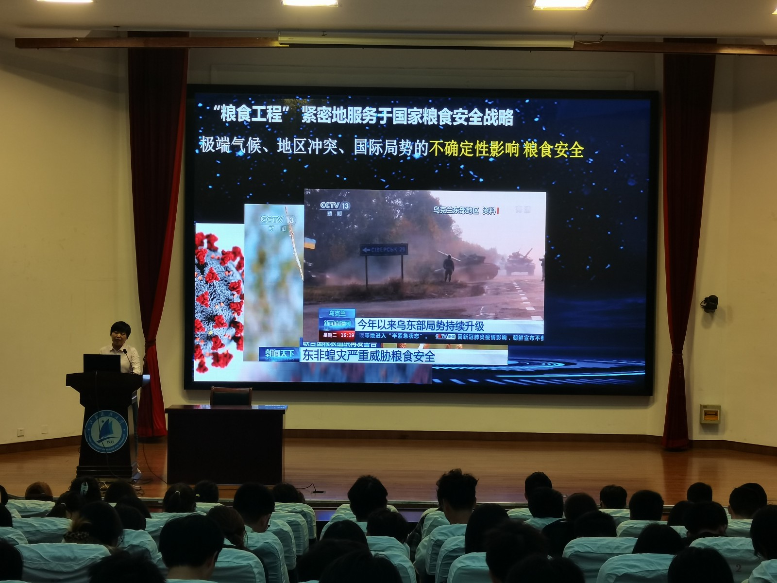 活動期間,軍事教研室全體教師利用《軍事理論與安全教育》課堂為1832名大一學生開設國家安全專題課,與《國家安全教育》通識課相互補充,帶領學生了解全民國家安全教育日設立10年來的主要成就。各學院還同步組織學生觀看“千萬高校學生同上一堂國家安全教育課”為主題的公開課,學習國家安全相關理論和知識。4月24日,特邀糧食學院賀培歡博士在夢溪校區演講廳為大一學生作《綠色科技儲糧——保障國家糧食安全》報告,引導學生結合本專業深刻認識國家安全的重要性。