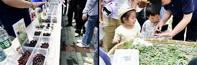 在采摘體驗區,大家紛紛化身采摘小能手,滿載而歸。科普區則給大家介紹了蠶寶寶的一生和蠶絲的多元化應用,讓參加活動的群眾了解小小蠶絲的巨大能量。