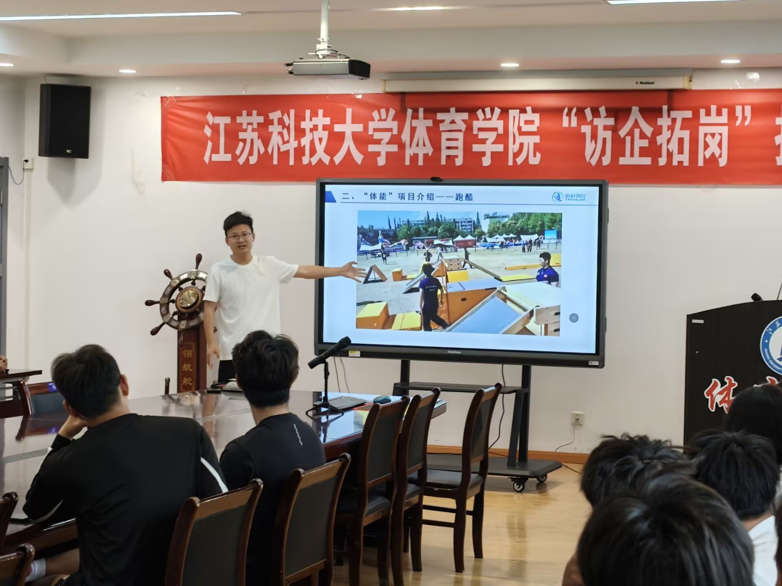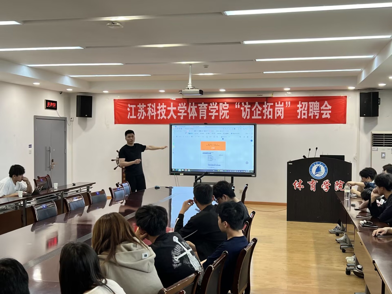 在宣講會環節,各企業代表輪番登臺,以生動的案例和詳實的數據,深入剖析了體育行業的發展趨勢與就業前景。蘇州一童科技有限公司著重介紹了其在兒童體育培訓領域的創新模式與市場布局,為有志于投身兒童體育教育事業的畢業生提供了廣闊的發展空間;鎮江悅動體育運營管理有限公司分享了場館運營、賽事策劃、業務范圍等方面的實踐經驗,讓同學們對體育產業的多元化發展有了更深刻的認識;江蘇鴻體育發展有限公司則展示了其在體育業務板塊、銷售、課程內容等方面的優勢,為畢業生們提供了多元化的職業選擇。
