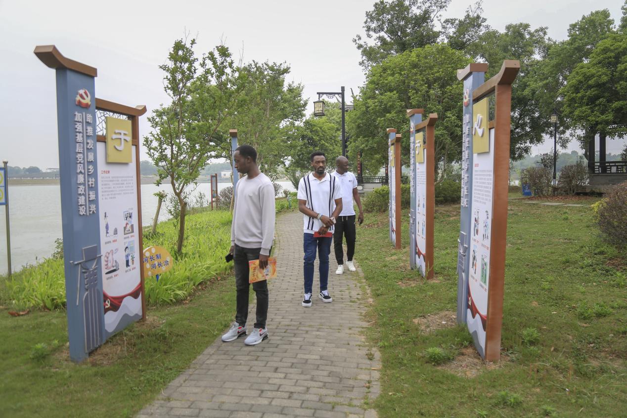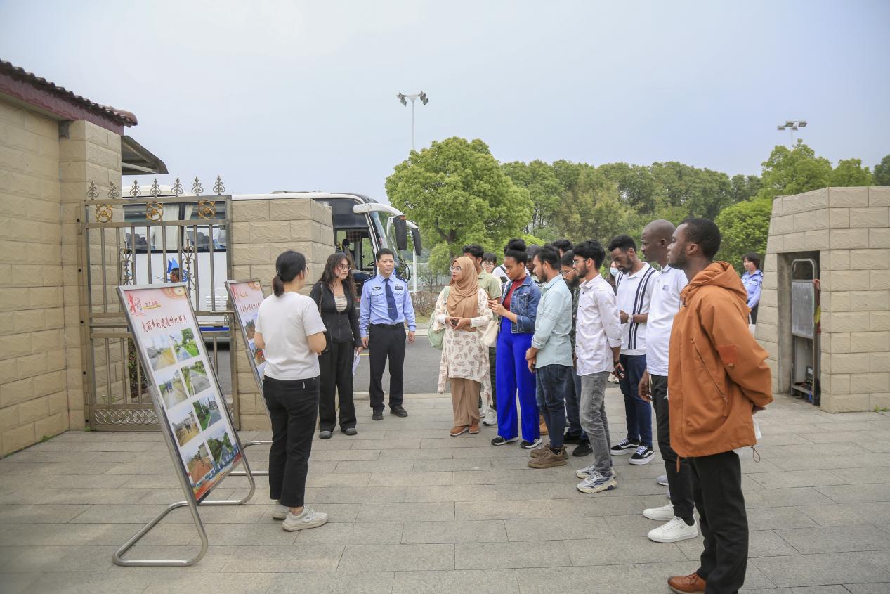 師生們首先參觀了水臺村的黨群服務中心,共同領略水臺村在鄉村振興背景下“農業+文旅+法治”融合發展的新面貌。村委會工作人員系統介紹了水臺村通過“村莊建設、產業發展、特色田園、鄉風文明”等系列建設行動,走出了一條“環境建設、文化建設、道德建設、產業建設”協調發展的鄉村治理與振興之路,先后獲評“江蘇省美麗鄉村示范村”“全國文明村”等榮譽稱號。來自加納的李蝶不斷調整相機角度,希望記錄下水臺村印象并與家人分享。“十年來,水臺村的變化真大!”他感慨道。