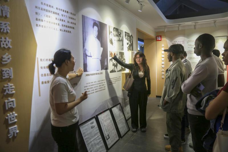 在村委會工作人員的帶領下,海教院師生們走進水臺村的文化名片—聞捷詩歌館。通過館中展陳的歷史照片、文學作品、文史資料以及聆聽講解的方式,聞捷詩人一生的足跡、家國情懷以及他對秩序、規則、公平的追求精神鮮活地展現在大家眼前。留學生們表示:《天山牧歌》中“牧人守護羊群”的畫面讓我們想起家鄉部落長老依據習慣法調解糾紛的場景;《非洲的火炬》贊揚了敢于斗爭的非洲人民,印證了中非人民源遠流長的共同追求法治正義的精神聯結。留學生喬納森高興地分享自己的參觀體會:“詩歌的浪漫與法律的理性,可以碰撞出獨特的火花,當詩人用充滿溫度的詩文來表達不同文明對規則的追求和理解時,法治不再是冰冷的條文,而成了維系共同生活的浪漫契約。”