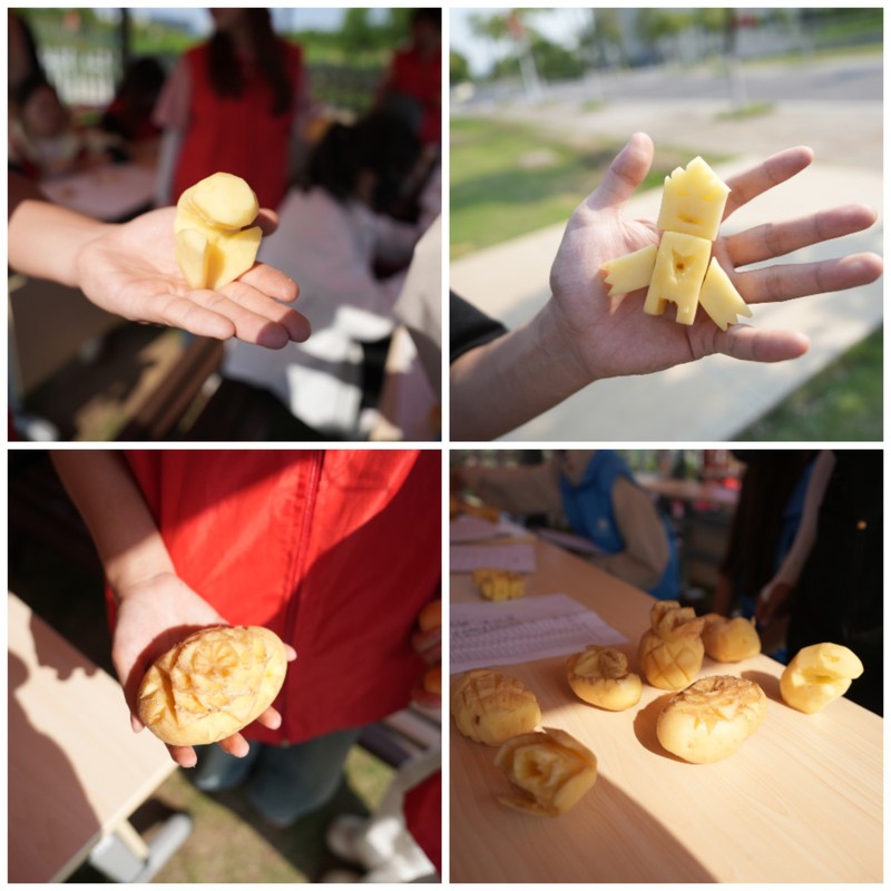 隨后,一場別開生面的“土豆雕刻展”讓人驚嘆勞動教育的另一種可能。同學(xué)們充分發(fā)揮想象力和創(chuàng)造力,將普通的土豆雕刻成各種精美的作品。憨態(tài)可掬的萌寵、綻放的花朵、抽象的藝術(shù)等創(chuàng)意十足的作品紛紛誕生,令人眼前一亮。