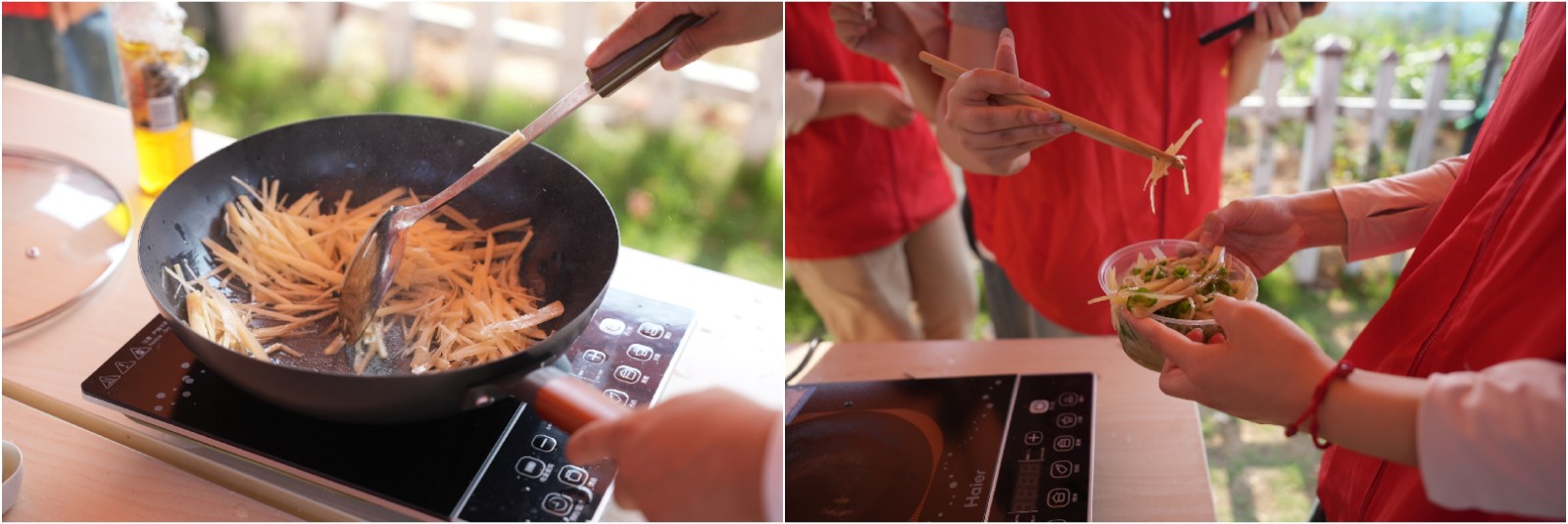 “要讓土豆絲脆而不生?!比卫蠋煷┧笤谠钆_間,現(xiàn)場演示從清洗、削皮到烹飪的全流程,手把手指導(dǎo)學(xué)生手持鍋鏟、控制火候,金黃的土豆在熱油中翻滾出豐收的香氣,師生共品勞動成果,洋溢著收獲的喜悅?,F(xiàn)場一名同學(xué)抹著額頭的汗珠笑道:“現(xiàn)在才懂得‘一粥一飯當思來之不易’的真正分量?!?/p>